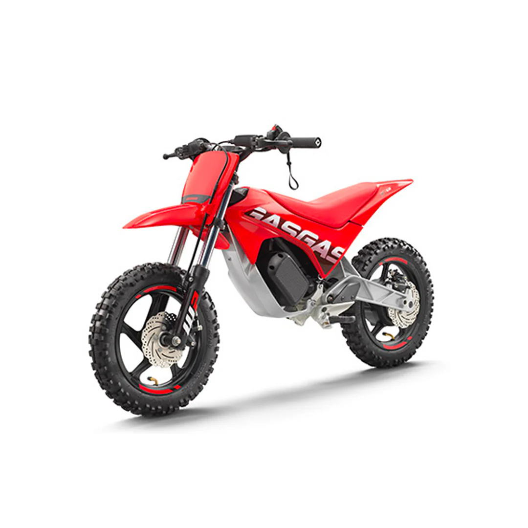 There's a new GASGAS dirt bike in town β the MC-E 2. All new, and all red, it's been designed for thrill-seeking youngsters (35-51 inches tall) that want to get to grips with offroad riding. It's battery-powered, inexpensive to run, with a full charge lasting well up to 100 minutes. It also has a ridiculously quick recharging time, which means the MC-E 2 offers day-long fun for all riders. Knowing that all kids will have an absolute blast tearing around the backyard on this little bike, we've fitted the MC-E 2 with three power modes and multiple options to adjust the ergonomics, so controlled progression is guaranteed. For eager kids, dirt bike riding starts right here.